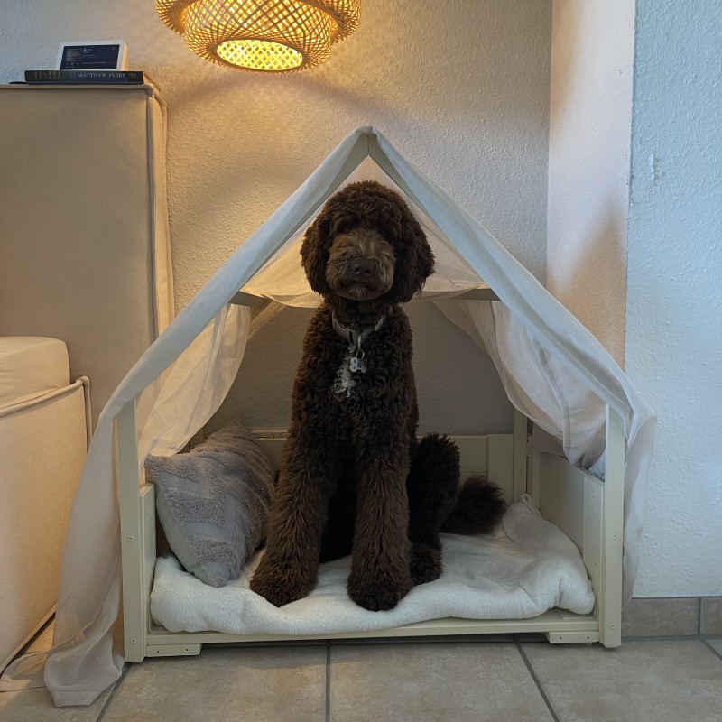 Königspudel, schokobraun mit weißem Fleck an der Brust