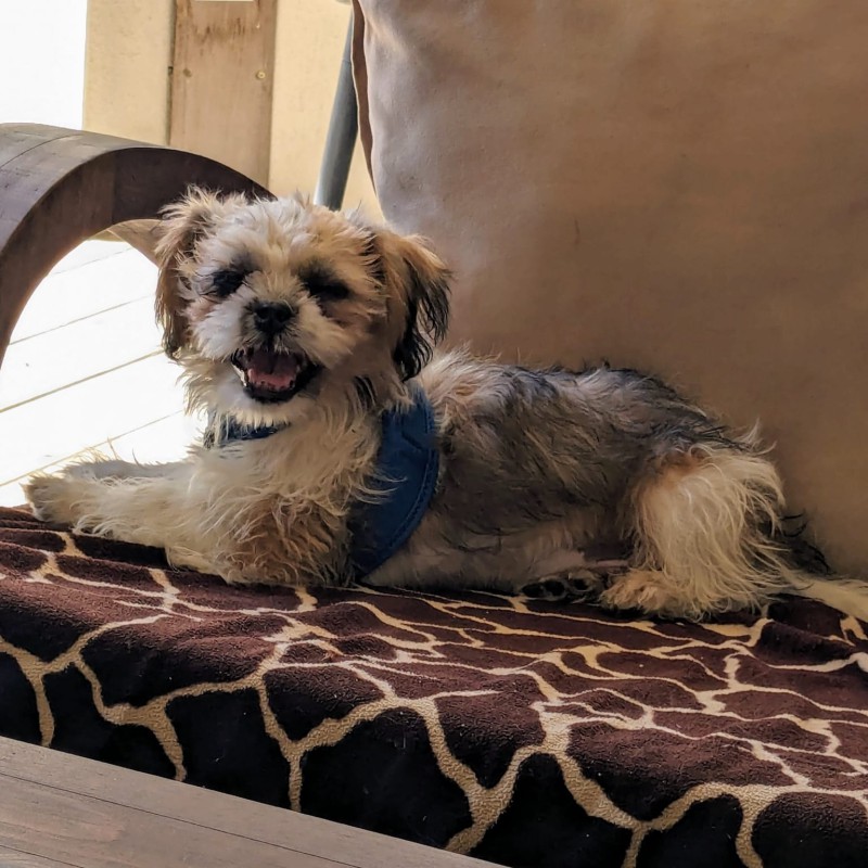 Mâle de 4 mois, diverses couleurs : blanc, beige, marron et mèches marron très foncé.